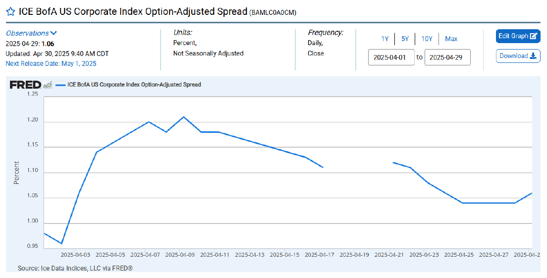 The rise in the capitulation signal coincided with the widening of high-yield spreads. The ICE BofA US High Yield Index Option-Adjusted Spread widened sharply due to investor uncertainty and a pause in bond purchases. High-yield spreads were relatively tight at the beginning of the month, hovering around 345-350 basis points over the U.S. Treasury. After the tariff announcement, spreads widened substantially, pushing toward 450-475 bps – a jump of about 100-150 basis points in just a few days. Some of the drivers leading to this blow out include the spike of the U.S. 10-year mentioned earlier, a general risk-off sentiment prior to the 90-day tariff pause, and broader growth concerns surrounding the economy which led to slower buying in fixed income. Nonetheless, spreads came back down to around 370 bps at the end of the month, only 20-25 bps higher from where we started at the beginning of April. The key range to monitor going forward will be whether high yield spreads reach territories that exceed the 800-1000 bps mark which were previously seen during the 2008 financial crisis and COVID.
