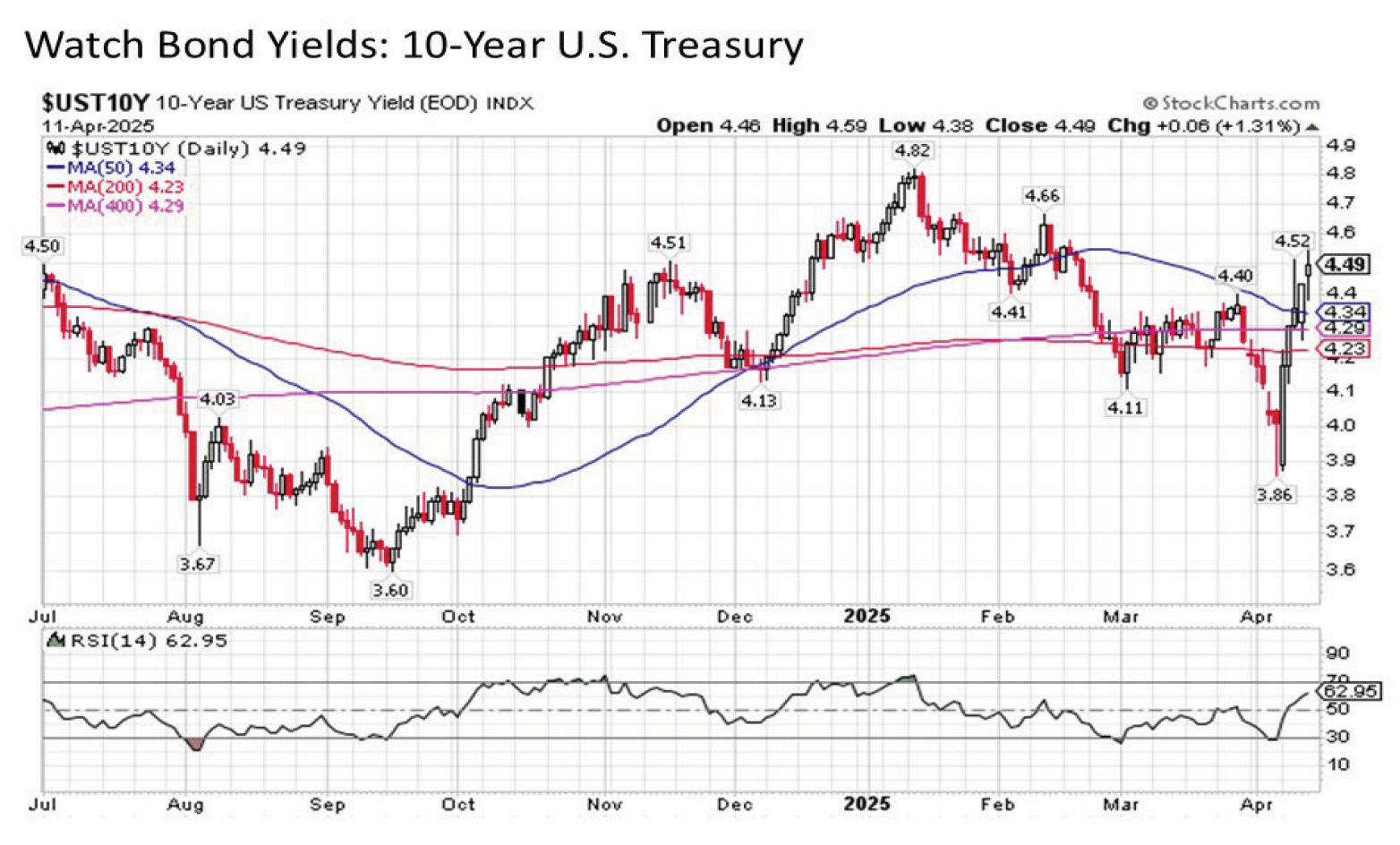 Of course, the arguably more important story that merits watching not only for the short-term but for the intermediate-term and long-term through the remainder of the year and beyond is the bond market. After all, it was the dramatic surge in Treasury yields including the 10-Year from below 3.9% during the overnight heading into Monday’s trading last week to over 4.5% by Wednesday coupled with the precipitous drop in the U.S. dollar was the very likely catalyst for the 90-day pause (forget about trade wars – a swift capital flight out of the U.S. evaporating Treasury market liquidity while sending borrowing costs soaring and the dollar precipitously declining is an effective way to tame the U.S. tariff impulse really fast). Yields moved relentlessly and sharply higher all last week, and it will be important to watch to see if this recent surge starts to level out to start the new trading week.