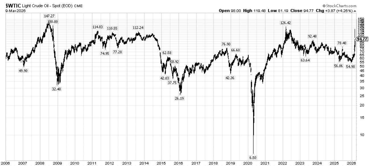 Let’s begin with the headline grabber, which has been the price of oil. With traffic through the Strait of Hormuz having effectively ground to a halt, the price of oil has predictably spiked. After bottoming just below $55 per barrel in mid-December and still hovering around $64 per barrel in late February, the spot price of West Texas Intermediate crude oil briefly surged toward $120 per barrel before settling just below $95 at the close on Monday. Brent crude oil had a similar trajectory, having risen from around $59 per barrel in mid-December and $70 per barrel in late February to over $105 per barrel before settling just below $99 yesterday. These are big spikes that could understandably spark stock investor and inflation watcher concern. But let’s put them in a broader context.