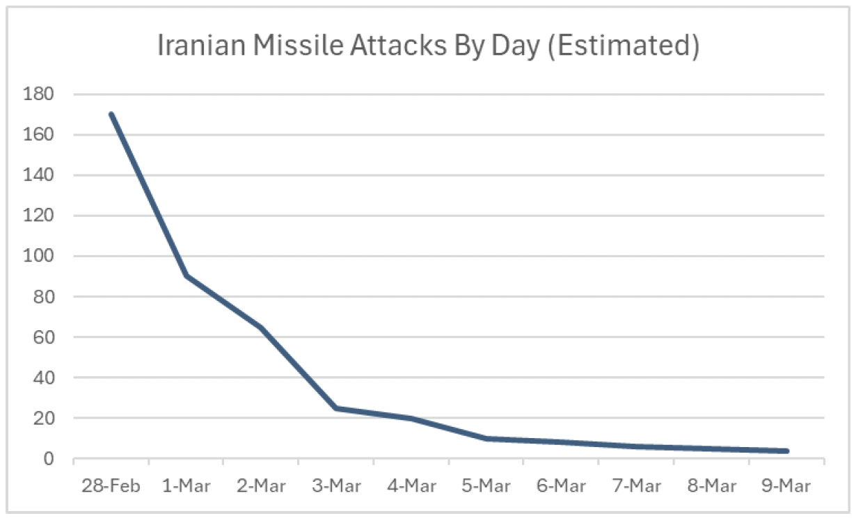 So, what about the ongoing conflict in Iran and the expected impact on oil prices going forward? Expect continued volatility absolutely. But here is the reality. The conflict with Iran may continue to drag on for a few more weeks or perhaps even months. But the ability of the Iranian regime to counterattack across the region is being depleted by the day. Consider the following chart showing estimated Iranian missile attacks by day since the conflict began the Saturday before last. From around 170 on February 28 to 4 yesterday. While ten days is an insufficiently large sample size, a simple trend analysis coupled with the -97% decline in missile attacks suggests that the worst is likely by far behind us in this regard.