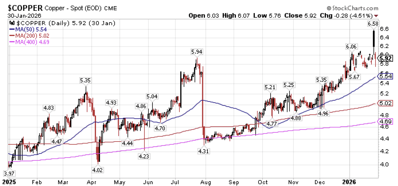 Over the course of 2025, prices of copper rose from approximately $8000 per ton to the mid $12,000s. The metal got a significant boost over the summer after President Donald Trump announced a 50% tariff on copper and copper-intensive goods, a move aimed at reducing reliance on foreign suppliers and strengthening the domestic supply chain. Later that month, the administration clarified that the final tariff would apply only to semi-finished copper products and copper-intensive derivatives, not raw or refined copper. This caused prices to drop briefly, but supply disruptions, most notably major mudflows at Freeport McMoRan’s Grasberg mine, one of the largest supply sites in the world for copper, sent prices back on a steady upward trend. The metal finished the year up more than 40%, its biggest annual jump since 2009. Priced per pound, copper is currently trading near $5.92 with prices topping $6.50 just last week. Overall, the outstanding performance represents a structural reassessment of one of the most frequently utilized metals globally.