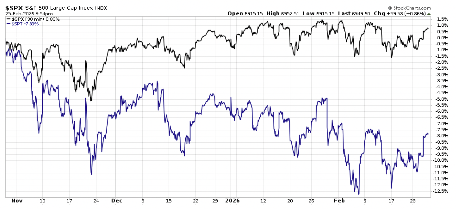 A new season underway.  So what does the new tech reality look like as we work through the winter of 2026?  The old moon first started falling on the tech sector all the way back around Halloween, and the storm clouds are slowly continuing to accumulate.  Consider the chart below showing the cumulative return of the S&P 500 versus the Information Technology sector since October 30, 2025.  While the S&P 500 is essentially flat at up less than +1% over this time period, the tech sector is lower by nearly -8%.